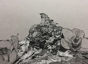 Justin has recently graduated with a BA(Hons) Fine Arts degree but has been working hard and receiving attention in Singapore, Japan and America. Lim’s work is phenomenal for its demonstration of technical finesse with the pencil or graphite. Each drawing is never just a still life but also communicates meaningfully as a kind of contemporary vanitas, a meditation upon mortality and life. His renditions of over polished and aestheticised visions of dying flora and fauna and skulls strikes a powerful tension with his lifelike methodology.