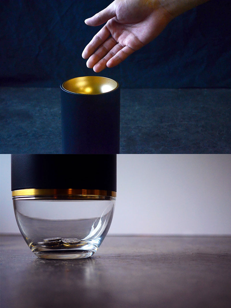 This coin bank encourages user to empathise with those in need via clever design. An internal separator splits the coins into personal savings (the opaque area) and a charitable amount (glass base). Once the personal savings area is filled, additional coins will fall into the charitable area, suggesting that once you have enough, you can afford to provide to others.