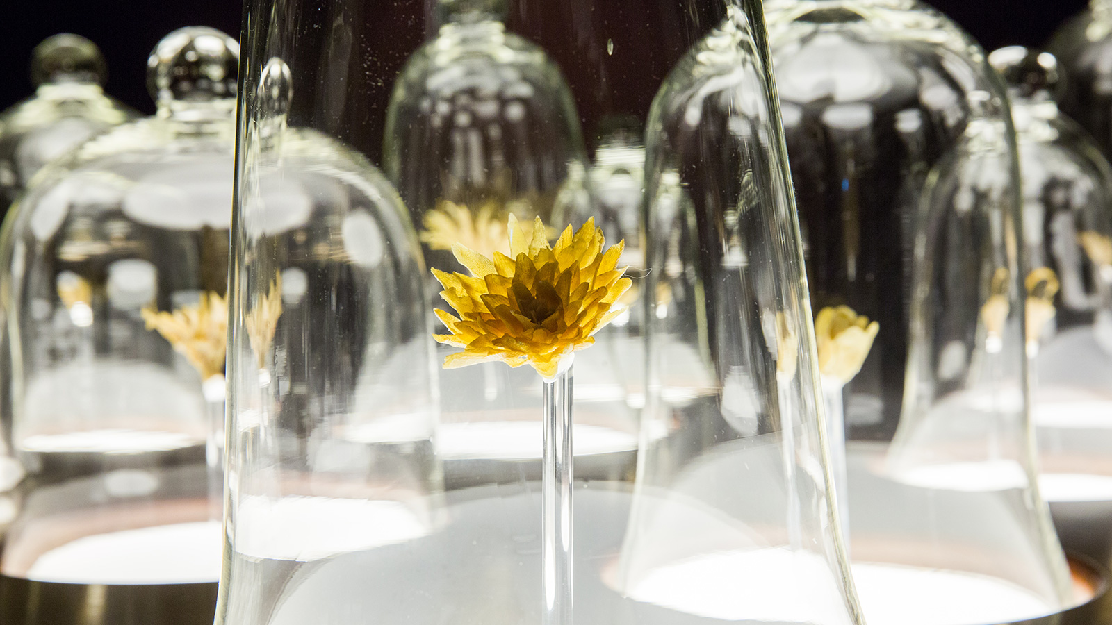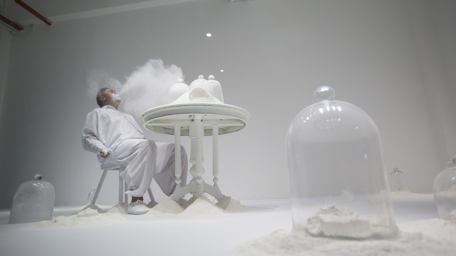 Ezzam is a multi-disciplinary artist, but his mediums of choice are performance and installation art. His artworks for the President's Young Talents consist of fragile, miniature flowers shaped from flakes of dead skin, and ephemeral sculptures that consist of little but talcum powder. Animating these otherwise mute objects, however, is the artist’s living, breathing body. The skin is his own, culled over a period of time from the soles of his feet, and the powder sculptures are remnants of his performances, into which his perspiration is mixed.