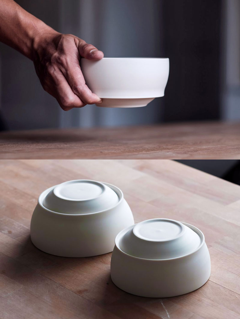 Many run the risk of spilling a bowl's contents when they try to manoeuvre their fingers out from between the bowl's foot ring and the table surface. Waist Bowl addresses this problem with an elevated foot ring that is moulded for ideal grip from one's finger pads.