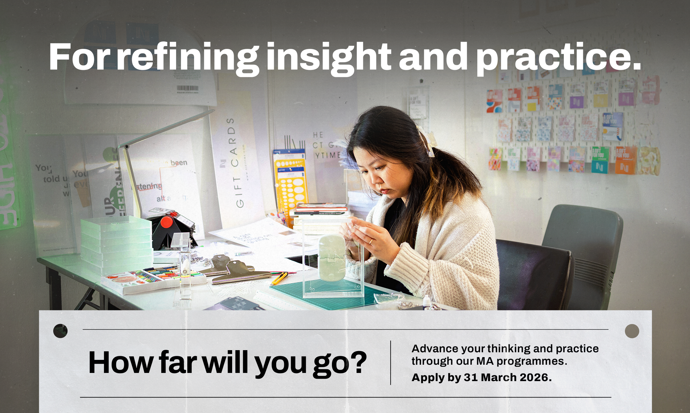 How far will you go to refine insight and practice? Or to challenge boundaries and perspectives? Through our one-year* MA programmes, you will gain a spectrum of perspectives to develop forward-thinking ideas and approaches to advance your research and practice in broader, deeper ways to critically and creatively address the needs of a changing world. Take the next step in your postgraduate education at Asia’s leading contemporary arts and design institution.