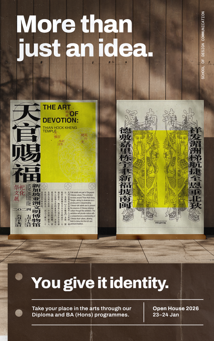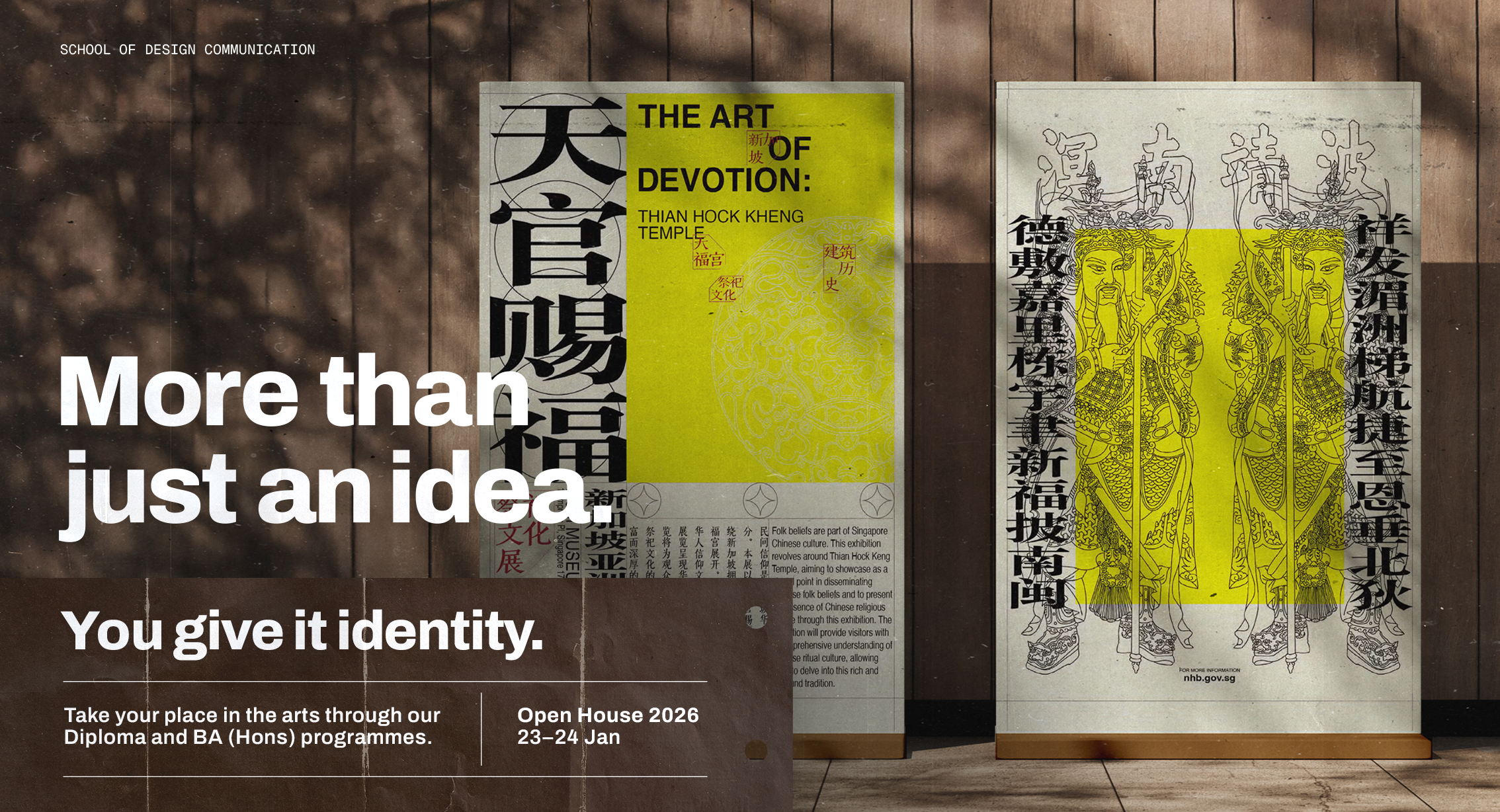 Alighting For Lola (2021), directed by Kaizerin L. Tanzil, BA (Hons) Film | Bluu by Sitikshu Badani, BA (Hons) Product Design | Eka by Putri Adif, BA (Hons) Fashion Design and Textiles | In Youthful Company (2023), School of Contemporary Music | Roots/Routes (2025), Diploma in Dance | The Art of Devotion: Thian Hock Kheng Temple by Ng Kai Yun, BA (Hons) Design Communication | Echoes of the Bay: VR narratives from Singapore's shores, BA (Hons) Arts Management | WuKong: Patch 2.0.25 by Tiara Choo Meisin, Diploma in Fine Arts